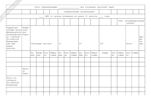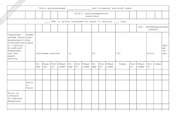 Опись предъявляемых для погашения векселей (для юридических лиц)