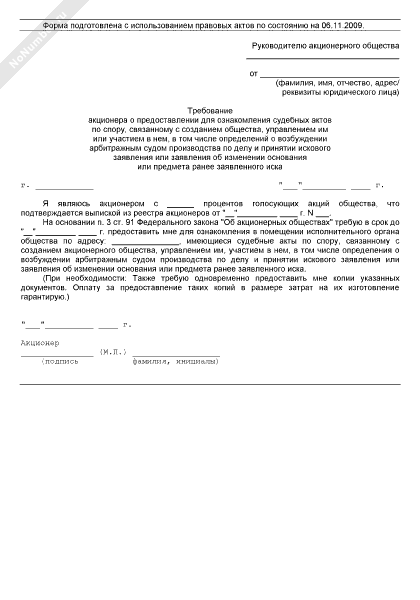 - 25Требование акционера о предоставлении для ознакомления судебных актов по спору, связанному с созданием общества, управлением им или участием в нем, в том числе определений о возбуждении арбитражным судом производства по делу и принятии искового заявления или заявления об изменении основания или предмета ранее заявленного иска