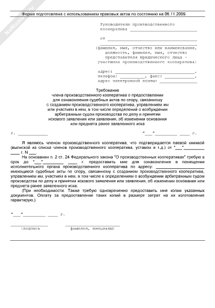 - 27Требование члена производственного кооператива о предоставлении для ознакомления судебных актов по спору, связанному с созданием производственного кооператива, управлением им или участием в нем, в том числе определений о возбуждении арбитражным судом производства по делу и принятии искового заявления или заявления, об изменении основания или предмета ранее заявленного иска