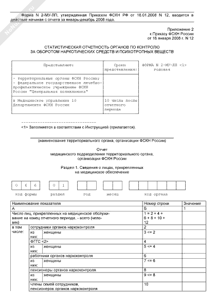 - 185Отчет медицинского подразделения территориального органа, организации ФСКН России. Форма № 2-МУ-ЛП