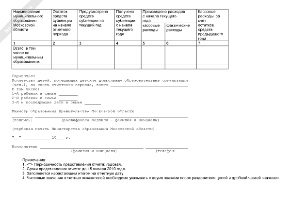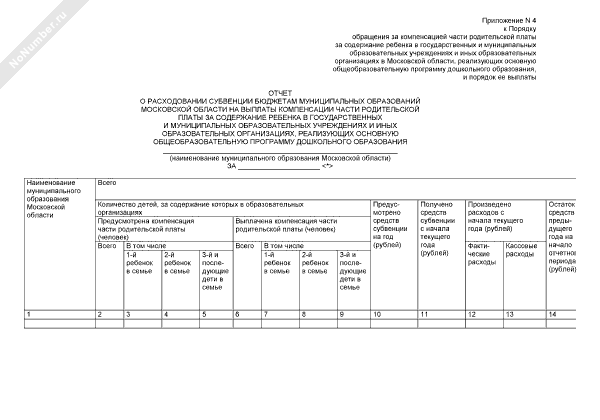 - 187Отчет Министерства образования МО о расходовании субвенции бюджетам муниципальных образований Московской области на выплаты компенсации части родительской платы за содержание ребенка в государственных и муниципальных образовательных учреждениях и иных образовательных организациях, реализующих основную общеобразовательную программу дошкольного образования (квартальный, годовой)