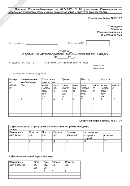 - 315Отчет о движении хлебопродуктов и тары на элеваторах и складах. Отраслевая форма № ЗПП-37