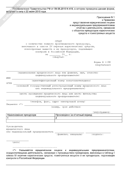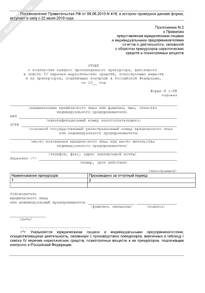 - 433Отчет о количестве каждого произведенного прекурсора, внесенного в список IV перечня наркотических средств, психотропных веществ и их прекурсоров, подлежащих контролю в Российской Федерации. Форма № 1-ПП (годовая)