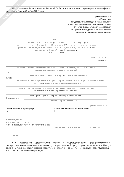 - 434Отчет о количестве каждого реализованного прекурсора, внесенного в таблицы I и II списка IV перечня наркотических средств, психотропных веществ и их прекурсоров, подлежащих контролю в Российской Федерации. Форма № 1-РП (годовая)