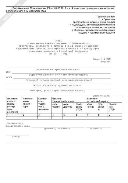 - 437Отчет о количестве каждого ввезенного (вывезенного) прекурсора, внесенного в таблицы I и II списка IV перечня наркотических средств, психотропных веществ и их прекурсоров, подлежащих контролю в Российской Федерации. Форма № 1-ВВП (годовая)