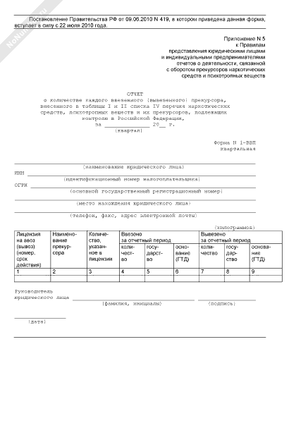 - 436Отчет о количестве каждого ввезенного (вывезенного) прекурсора, внесенного в таблицы I и II списка IV перечня наркотических средств, психотропных веществ и их прекурсоров, подлежащих контролю в Российской Федерации. Форма № 1-ВВП (квартальная)