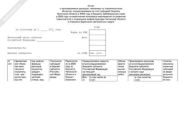 - 656Отчет о произведенных расходах, связанных со строительством объектов, осуществляемых за счет субсидий бюджету Читинской области в 2008 году и бюджету Забайкальского края в 2009 году на выполнение комплекса мероприятий по развитию транспортной и социальной инфраструктуры Читинской области и Агинского Бурятского автономного округа