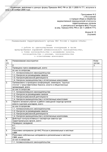 - 687Отчет о работе по адвокатированию конкуренции в части предупреждения нарушений антимонопольного законодательства, а также законодательства о размещении заказов, законодательства о рекламе, законодательства о естественных монополиях. Форма № 13 (годовая)