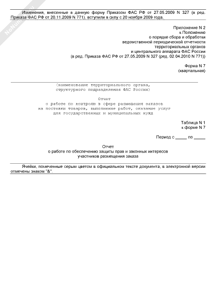 - 692Отчет о работе по контролю в сфере размещения заказов на поставки товаров, выполнение работ, оказание услуг для государственных и муниципальных нужд. Форма № 7 (квартальная)