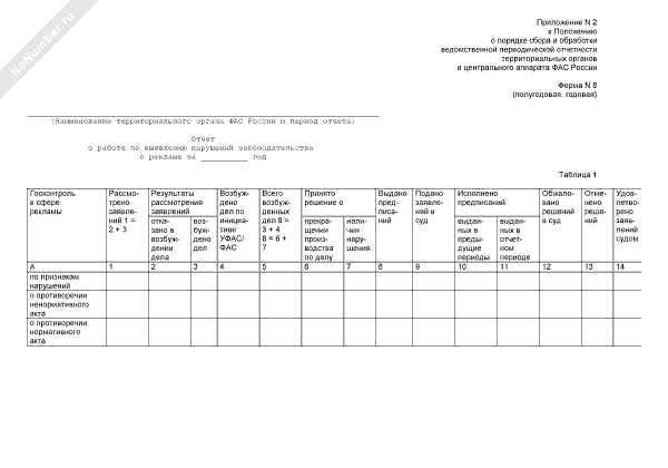 - 693Отчет о работе по выявлению нарушений законодательства о рекламе. Форма № 8 (полугодовая, годовая)