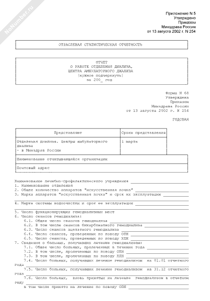 - 725Отчет о работе отделения диализа, центра амбулаторного диализа. Форма № 68