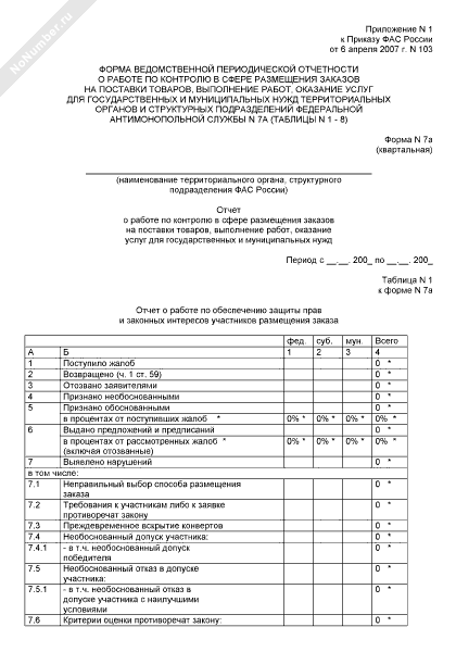 - 721Отчет о работе по контролю в сфере размещения заказов на поставки товаров, выполнение работ, оказание услуг для государственных и муниципальных нужд территориальных органов и структурных подразделений Федеральной антимонопольной службы. Форма № 7A