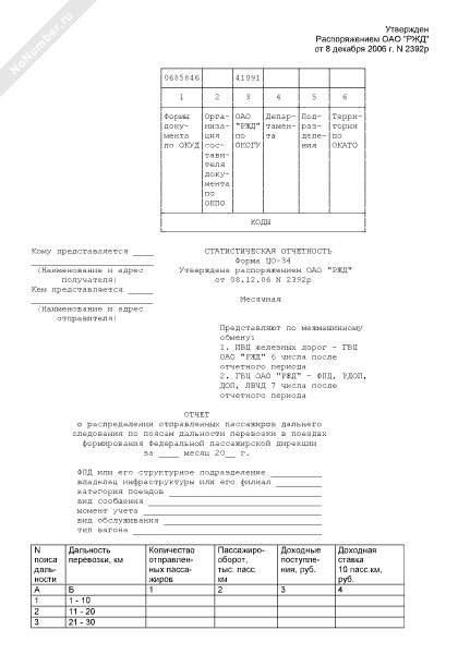 - 736Отчет о распределении отправленных пассажиров дальнего следования по поясам дальности перевозки в поездах формирования Федеральной пассажирской дирекции. Форма № ЦО-34