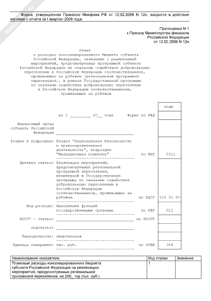 - 788Отчет о расходах консолидированного бюджета субъекта Российской Федерации, связанных с реализацией мероприятий, предусмотренных программой субъекта Российской Федерации по оказанию содействия добровольному переселению в Российскую Федерацию соотечественников, проживающих за рубежом (региональной программой переселения), в рамках Государственной программы по оказанию содействия добровольному переселению в Российскую Федерацию соотечественников, проживающих за рубежом