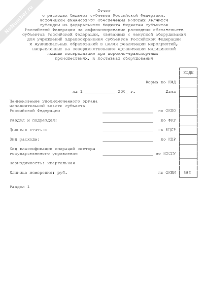 - 806Отчет о расходах бюджета субъекта РФ, источником финансового обеспечения которых являются субсидии из федерального бюджета бюджетам субъектов РФ на софинансирование расходных обязательств субъектов РФ, связанных с закупкой оборудования для учреждений здравоохранения субъектов РФ и муниципальных образований в целях реализации мероприятий, направленных на совершенствование организации медицинской помощи пострадавшим при дорожно-транспортных происшествиях, и поставках оборудования
