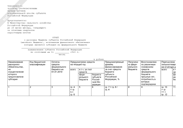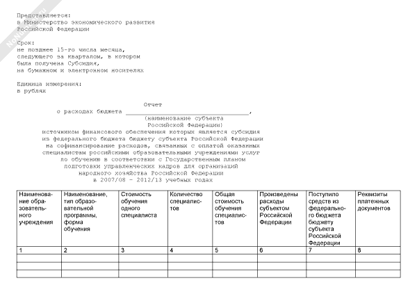 - 810Отчет о расходах бюджета субъекта Российской Федерации источником финансового обеспечения которых является субсидия из федерального бюджета бюджету субъекта Российской Федерации на софинансирование расходов, связанных с оплатой оказанных специалистам российскими образовательными учреждениями услуг по обучению в соответствии с государственным планом подготовки управленческих кадров для организаций народного хозяйства Российской Федерации в 2007/08–2012/13 учебных годах