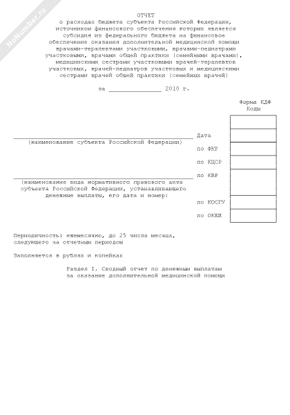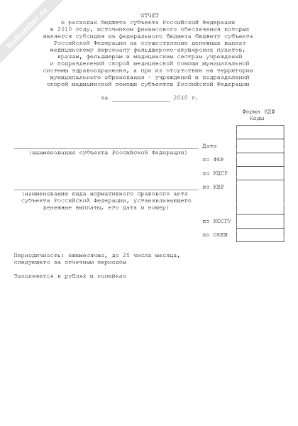 - 815Отчет о расходах бюджета субъекта Российской Федерации в 2010 году, источником финансового обеспечения которых является субсидия из федерального бюджета бюджету субъекта Российской Федерации на осуществление денежных выплат медицинскому персоналу фельдшерско-акушерских пунктов, врачам, фельдшерам и медицинским сестрам учреждений и подразделений скорой медицинской помощи муниципальной системы здравоохранения, а при их отсутствии на территории муниципального образования — учреждений и подразделений скорой медицинской помощи субъектов Российской Федерации