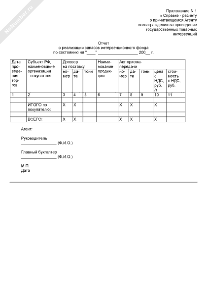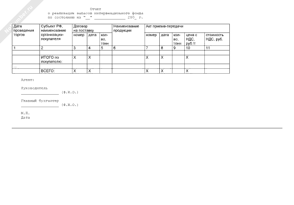 - 916Отчет о реализации запасов интервенционного фонда (приложение к справке-расчету о причитающемся агенту вознаграждении за проведение государственных товарных интервенций)