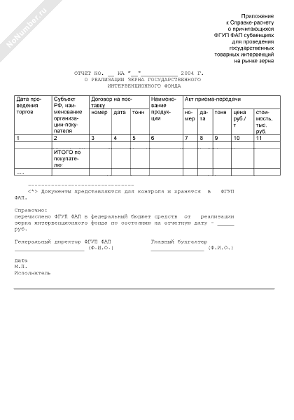 - 917Отчет о реализации зерна государственного интервенционного фонда (приложение к справке-расчету о подчиняющихся ФГУП ФАП субвенциях для проведения государственных товарных интервенций на рынке зерна)