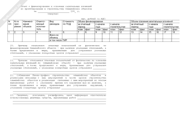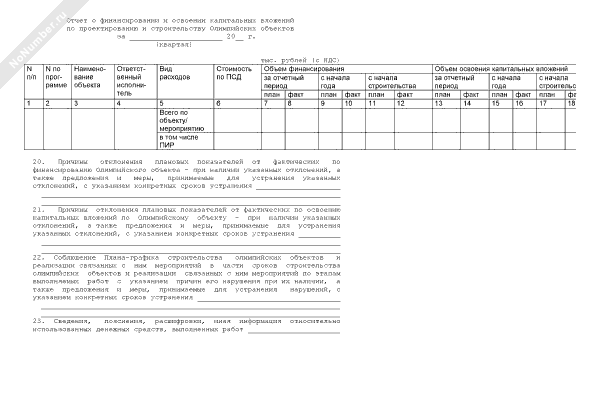 - 1107Отчет о финансировании и освоении капитальных вложений по проектированию и строительству Олимпийских объектов (сведения предоставляются ответственными исполнителями программы строительства — федеральными органами исполнительной власти, администрацией Краснодарского края, администрацией города Сочи)