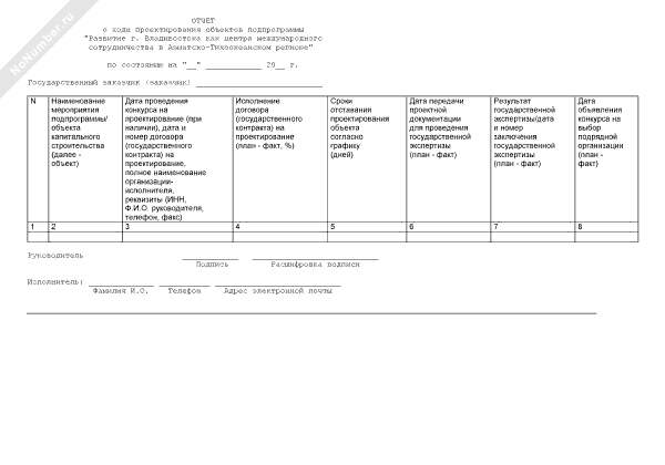- 1130Отчет о ходе проектирования объектов подпрограммы «Развитие г. Владивостока как центра международного сотрудничества в Азиатско-Тихоокеанском регионе». Форма предоставления отчетности № 1