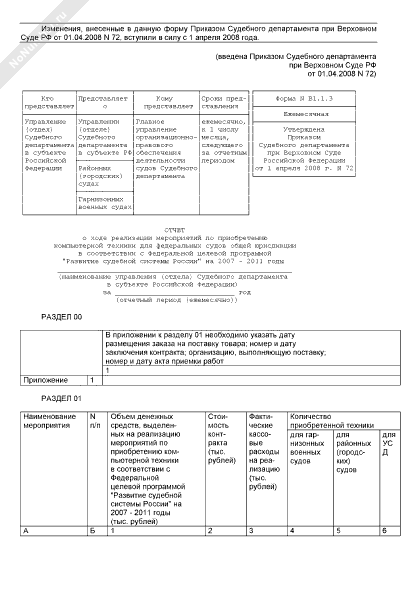 - 1137Отчет о ходе реализации мероприятий по приобретению компьютерной техники для федеральных судов общей юрисдикции в соответствии с Федеральной целевой программой «Развитие судебной системы России» на 2007–2011 годы. Форма № 1.1.3