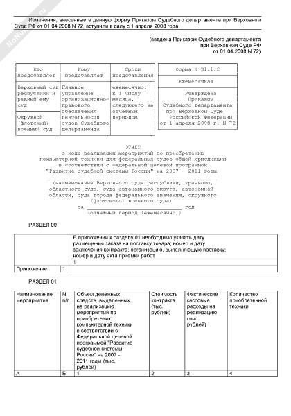 - 1136Отчет о ходе реализации мероприятий по приобретению компьютерной техники для федеральных судов общей юрисдикции в соответствии с Федеральной целевой программой «Развитие судебной системы России» на 2007–2011 годы. Форма № 1.1.2