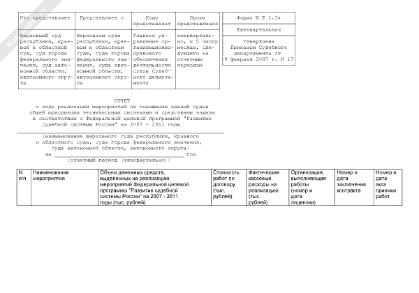 - 1134Отчет о ходе реализации мероприятий по оснащению зданий судов общей юрисдикции техническими системами и средствами защиты в соответствии с Федеральной целевой программой «Развитие судебной системы России» на 2007–2011 годы. Форма № В 1.3А