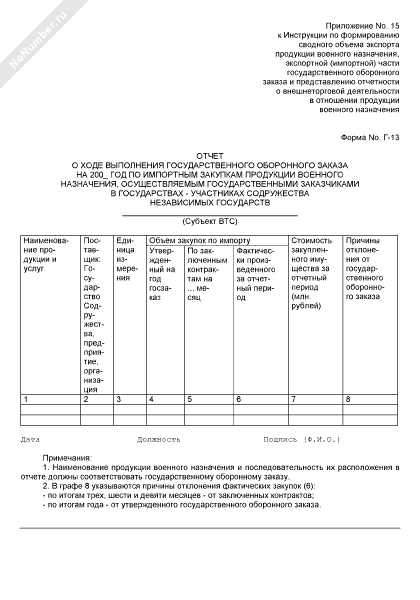 - 1123Отчет о ходе выполнения государственного оборонного заказа по импортным закупкам продукции военного назначения, осуществляемым государственными заказчиками в государствах — участниках Содружества Независимых Государств. Форма № Г-13