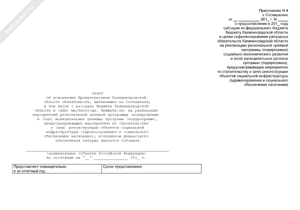 - 1235Отчет об исполнении Правительством Калининградской области обязательств, вытекающих из соглашения, в том числе о расходах бюджета Калининградской области и (или) местного(ых) бюджета(ов) на реализацию мероприятий региональной целевой программы (подпрограмм) и (или) муниципальных целевых программ (подпрограмм), предусматривающих мероприятия по строительству и (или) реконструкции объектов социальной инфраструктуры, источником финансового обеспечения которых является субсидия (приложение к соглашению о предоставлении субсидии)