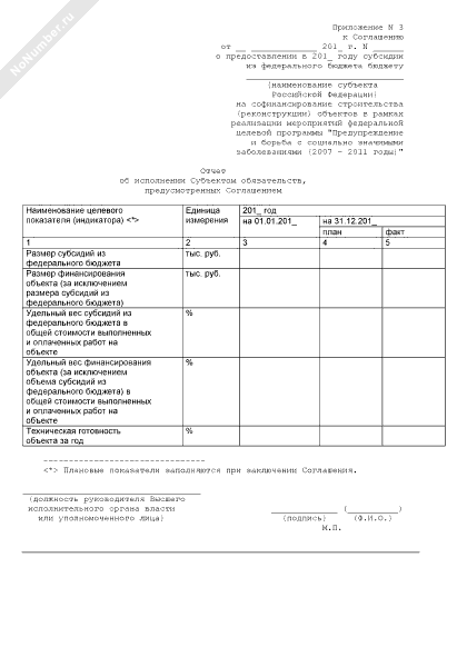 - 1234Отчет об исполнении субъектом обязательств, предусмотренных соглашением (приложение к соглашению о предоставлении субсидии из федерального бюджета бюджету субъекта Российской Федерации на софинансирование строительства (реконструкции) объектов в рамках реализации мероприятий федеральной целевой программы «Предупреждение и борьба с социально значимыми заболеваниями (2007–2011 годы)»)
