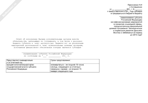 - 1229Отчет об исполнении Высшим исполнительным органом власти обязательств (приложение к соглашению о предоставлении субсидии из федерального бюджета бюджету субъекта Российской Федерации на софинансирование мероприятий по развитию социальной сферы, предусмотренных федеральной целевой программой «Экономическое и социальное развитие Дальнего Востока и Забайкалья на период до 2013 года»)