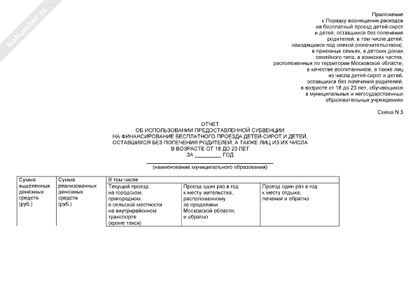 - 1243Отчет об использовании предоставленной субвенции на финансирование бесплатного проезда детей-сирот и детей, оставшихся без попечения родителей, а также лиц из их числа в возрасте от 18 до 23 лет (схема № 3)
