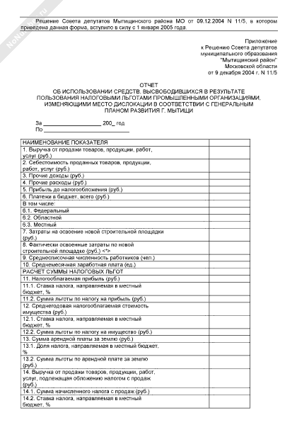 - 1252Отчет об использовании средств, высвободившихся в результате пользования налоговыми льготами по плате за землю промышленными организациями, изменяющими место дислокации в соответствии с генеральным планом развития города Мытищи Московской области