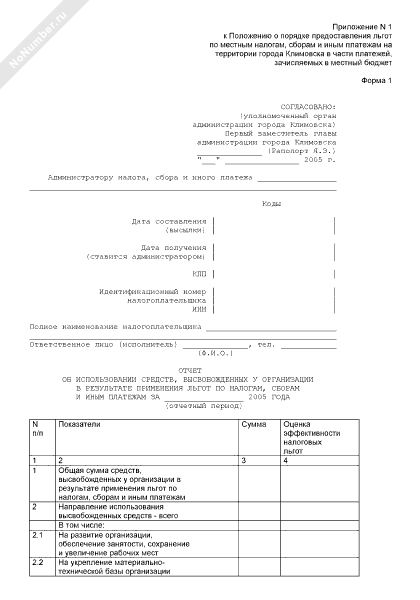 - 1247Отчет об использовании средств, высвобожденных у организации в результате применения льгот по налогам, сборам и иным платежам в г. Климовске Московской области (форма № 1)