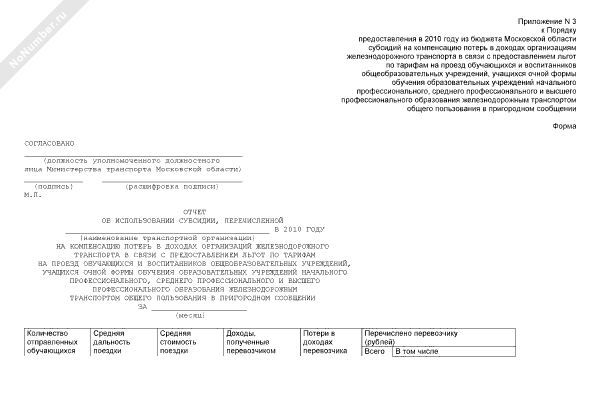 - 1253Отчет об использовании субсидии, перечисленной на компенсацию потерь в доходах организаций железнодорожного транспорта в связи с предоставлением льгот по тарифам на проезд обучающихся и воспитанников общеобразовательных учреждений, учащихся очной формы обучения образовательных учреждений начального профессионального, среднего профессионального и высшего профессионального образования железнодорожным транспортом общего пользования в пригородном сообщении Московской области