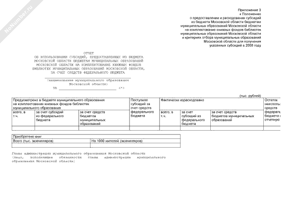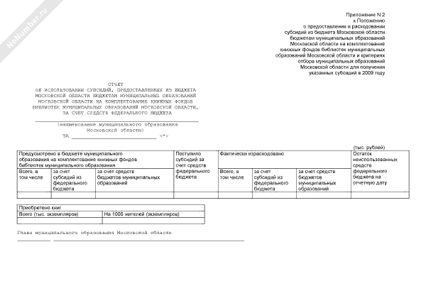 - 1250Отчет об использовании субсидий, предоставленных из бюджета Московской области бюджетам муниципальных образований Московской области на комплектование книжных фондов библиотек муниципальных образований Московской области, за счет средств федерального бюджета