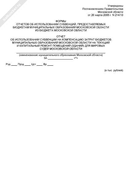 - 1260Отчет об использовании субвенции на компенсацию затрат бюджетов муниципальных образований Московской области на текущий и капитальный ремонт помещений (зданий) для мировых судей Московской области