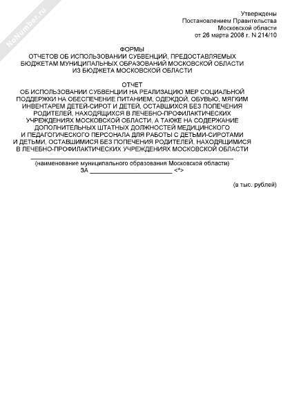 - 1254Отчет об использовании субвенции на реализацию мер социальной поддержки на обеспечение питанием, одеждой, обувью, мягким инвентарем детей-сирот и детей, оставшихся без попечения родителей, находящихся в лечебно-профилактических учреждениях Московской области, а также на содержание дополнительных штатных должностей медицинского и педагогического персонала для работы с детьми-сиротами и детьми, оставшимися без попечения родителей, находящимися в лечебно-профилактических учреждениях Московской области