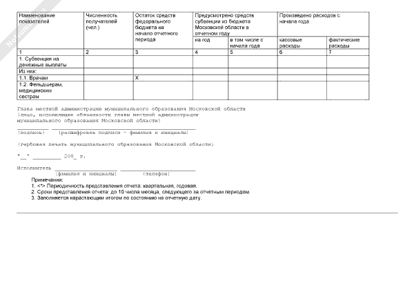 - 1255Отчет об использовании субвенции на денежные выплаты медицинскому персоналу фельдшерско-акушерских пунктов, врачам, фельдшерам и медицинским сестрам скорой медицинской помощи за счет средств, перечисляемых из федерального бюджета Московской области