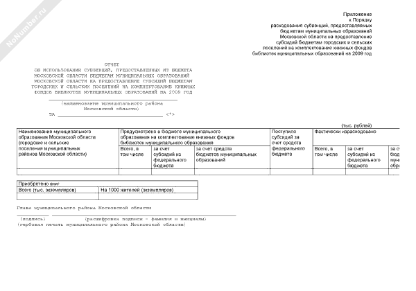 - 1251Отчет об использовании субвенций, предоставленных из бюджета Московской области бюджетам муниципальных образований Московской области на предоставление субсидий бюджетам городских и сельских поселений на комплектование книжных фондов библиотек муниципальных образований на 2009 год