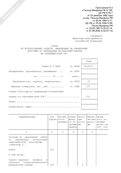 - 1286Отчет об использовании средств, выделенных на реализацию программ по ликвидации последствий аварии на Чернобыльской АЭС. Форма № 2-ЧАЭС