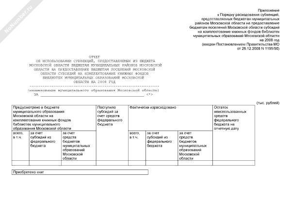 - 1298Отчет об использовании субвенций, предоставляемых из бюджета Московской области бюджетам муниципальных районов Московской области на предоставление бюджетам поселений Московской области субсидий на комплектование книжных фондов библиотек муниципальных образований Московской области на 2008 год