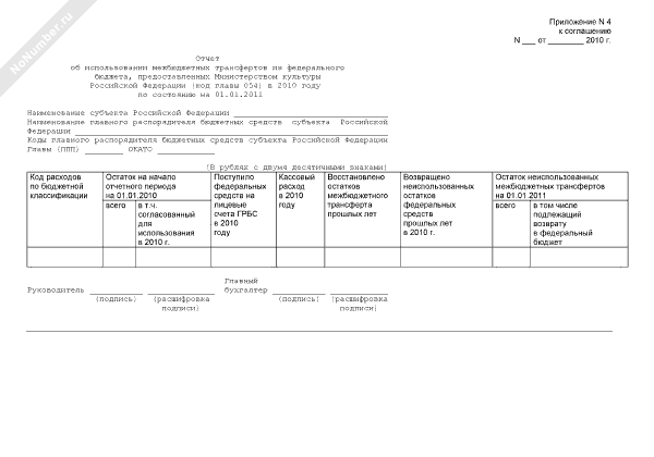 - 1385Отчет об использовании межбюджетных трансфертов из федерального бюджета, предоставленных Министерством культуры РФ (код главы 054) в 2010 году по состоянию на 01.01.2011 (приложение к соглашению между субъектом Российской Федерации и Министерством культуры РФ о предоставлении в 2010 году из федерального бюджета бюджету субъекта Российской Федерации иных межбюджетных трансфертов на комплектование книжных фондов библиотек муниципальных образований (государственных библиотек города Москвы или города Санкт-Петербурга))