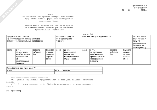 - 1384Отчет об использовании средств федерального бюджета, предоставленного в форме иных межбюджетных трансфертов бюджету на комплектование книжных фондов библиотек муниципальных образований (приложение к соглашению между субъектом Российской Федерации и Министерством культуры РФ о предоставлении в 2010 году из федерального бюджета бюджету субъекта Российской Федерации иных межбюджетных трансфертов на комплектование книжных фондов библиотек муниципальных образований (государственных библиотек города Москвы или города Санкт-Петербурга))