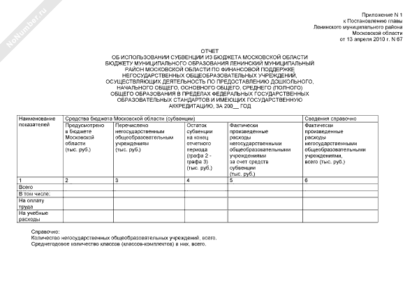 - 1386Отчет об использовании субвенции из бюджета МО бюджету муниципального образования Ленинский муниципальный район Московской области по финансовой поддержке негосударственных общеобразовательных учреждений, осуществляющих деятельность по предоставлению дошкольного, начального общего, основного общего, среднего (полного) общего образования в пределах федеральных государственных образовательных стандартов и имеющих государственную аккредитацию (представляется в Финансовое управление)