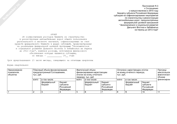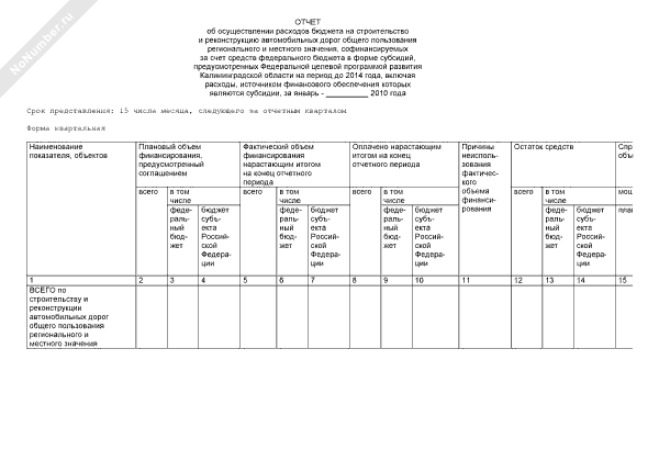 - 1503Отчет об осуществлении расходов бюджета на строительство и реконструкцию автомобильных дорог общего пользования регионального и местного значения, софинансируемых за счет средств федерального бюджета в форме субсидий (приложение к соглашению о предоставлении в 2010 году бюджету субъекта РФ субсидий на софинансирование мероприятий по строительству и реконструкции автомобильных дорог, предусмотренных федеральной целевой программой)