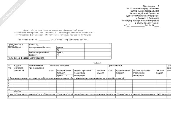 - 1504Отчет об осуществлении расходов бюджета субъекта Российской Федерации или бюджета г. Байконура (местных бюджетов), источником финансового обеспечения которых является субсидия (приложение к соглашению о предоставлении в 2010 году из федерального бюджета субсидий бюджетам субъектов Российской Федерации и бюджету г. Байконура на закупку автотранспортных средств и коммунальной техники)