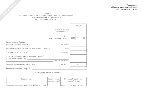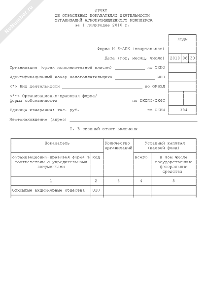 - 1518Отчет об отраслевых показателях деятельности организаций агропромышленного комплекса за I полугодие 2010 г. Форма № 6-АПК (квартальная)
