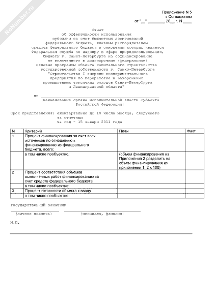 - 1540Отчет об эффективности использования субсидии за счет бюджетных ассигнований федерального бюджета, главным распорядителем средств федерального бюджета в отношении которых является Федеральная служба по надзору в сфере природопользования, бюджету г. Санкт-Петербурга на софинансирование не включенного в долгосрочные (федеральные) целевые программы объекта капитального строительства государственной собственности г. Санкт-Петербурга (приложение к соглашению)